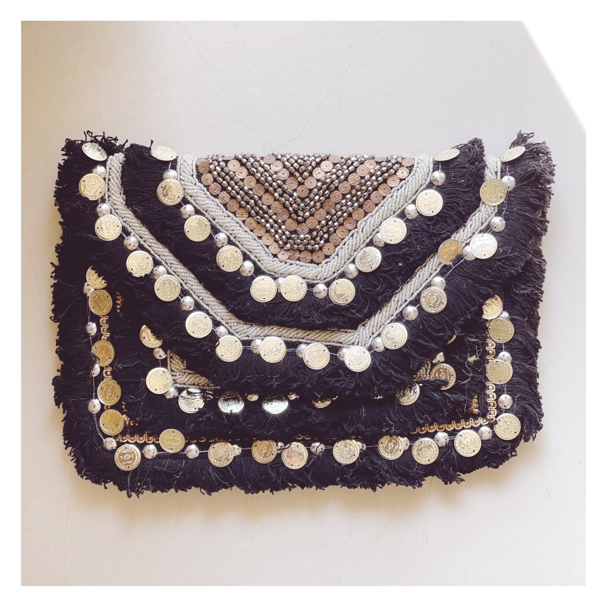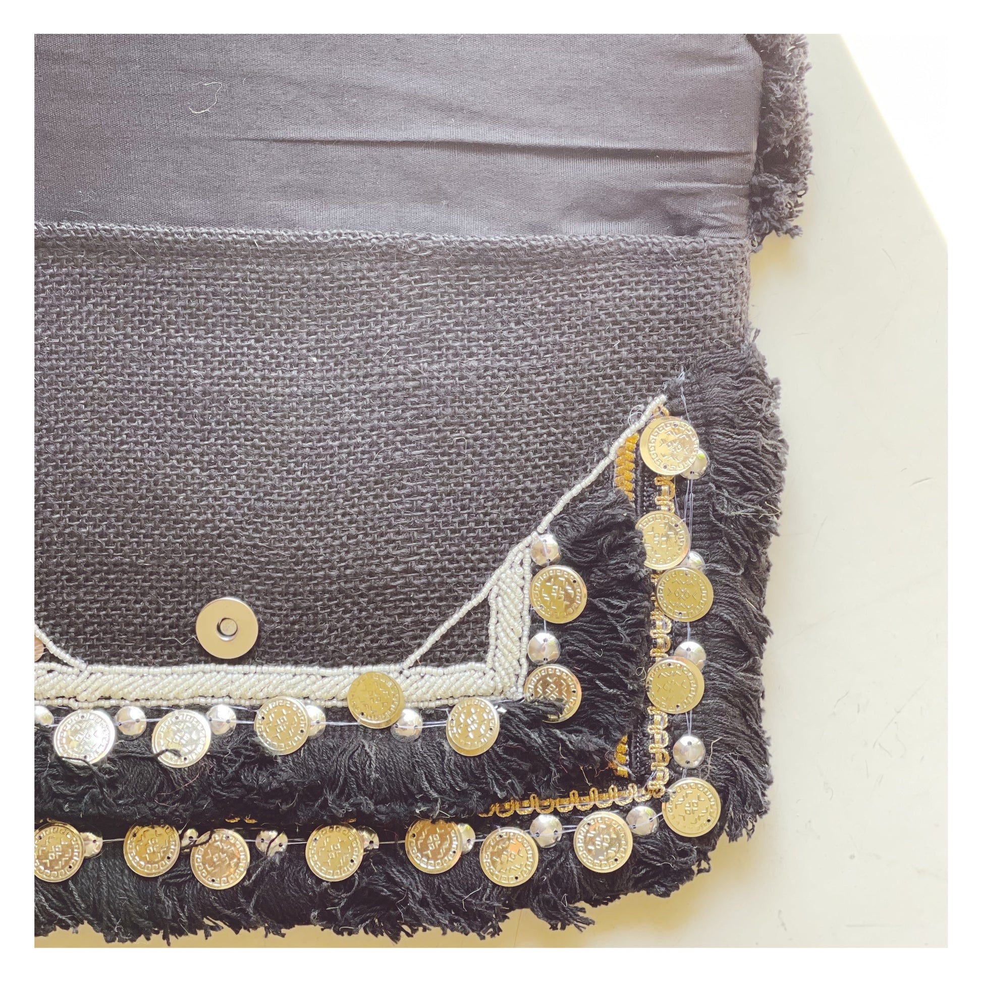Borsa a tracolla in juta, colore nero, ricamata con perline ai toni dell'argento e bronzo, piccole borchie e frange. L'interno foderato in cotone contiene una pratica tasca con zip. E' possibile indossarla sia con che senza la piccola catena dorata.