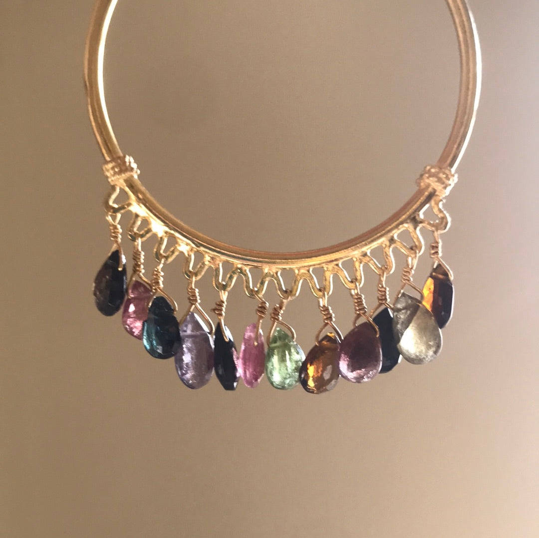 Orecchini a cerchio con pietre tormaline di colori vari, in argento 925 placcato oro.