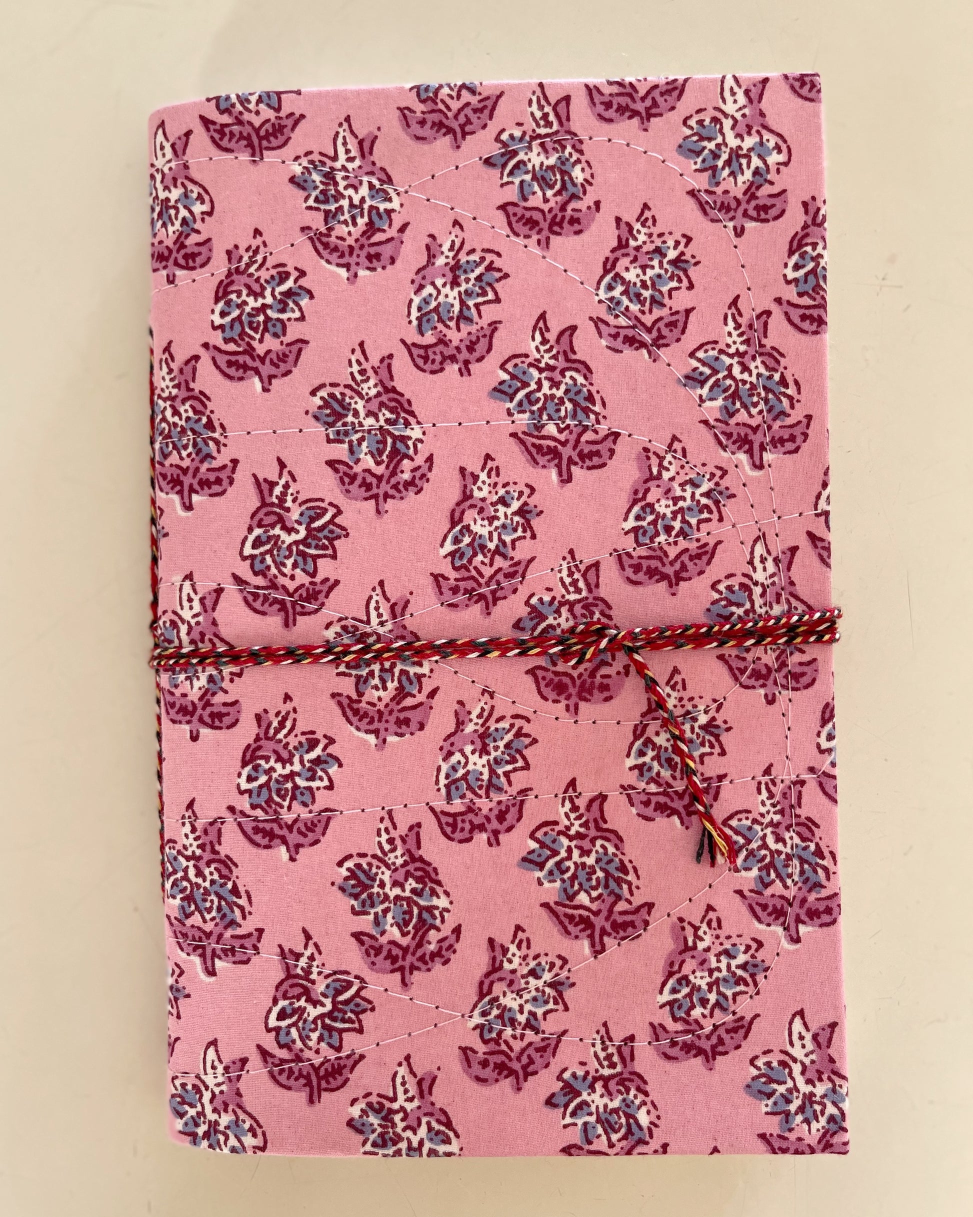 Quaderno con copertina rigida rivestita in cotone hand printed. Chiusura con cordino di cotone. Le pagine sono in carta riciclata bianca.