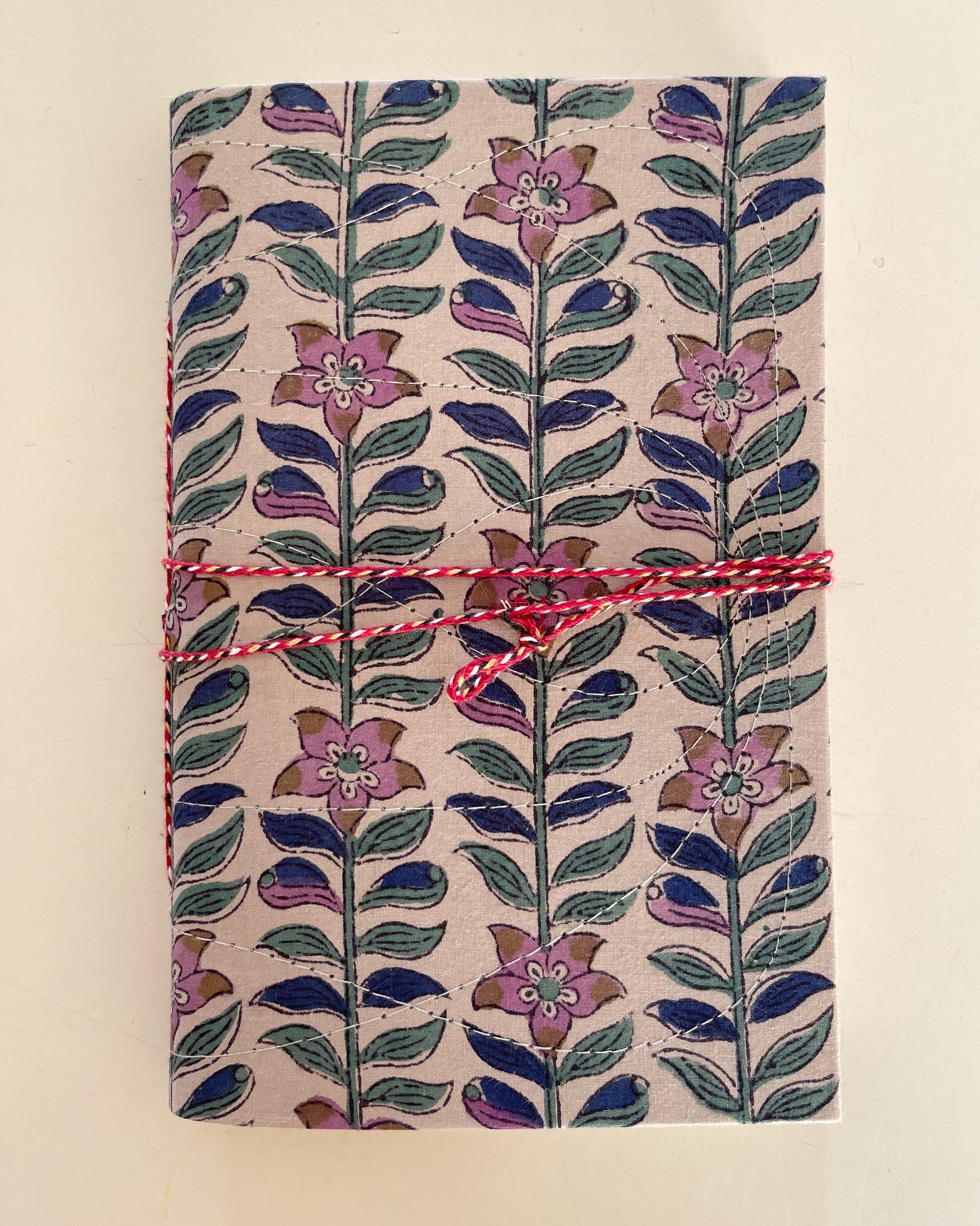 Quaderno con copertina rigida rivestita in cotone hand printed. Chiusura con cordino di cotone. Le pagine sono in carta riciclata bianca.